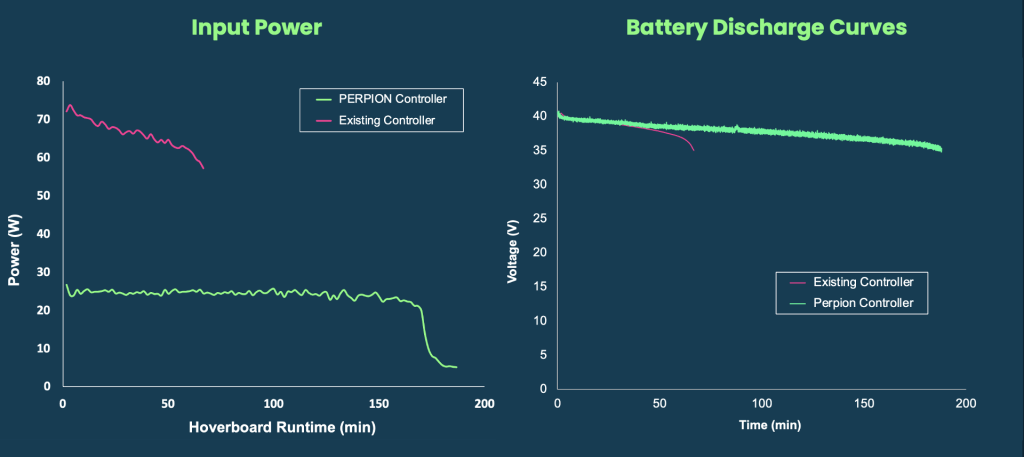 The graphs below highlight the results of a pilot test comparing Perpion-powered BLDC motors with conventional systems in a hoverboard application. Perpion technology delivered over 3X longer ride time, marking a major advancement in energy efficiency for personal mobility. This breakthrough enhances the hoverboarding experience—allowing for longer, more exciting rides, improved performance, and reduced charging needs. With 3X extended ride time and 3X lower charging costs, Perpion is redefining what’s possible in the world of electric rideables.